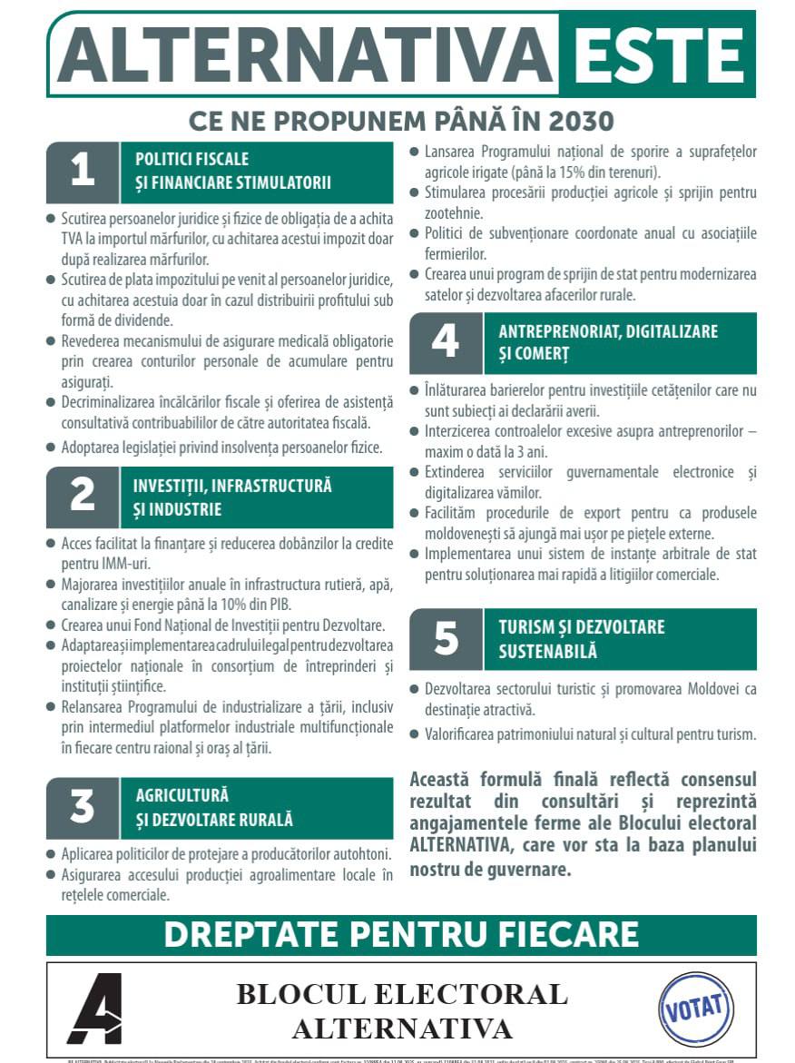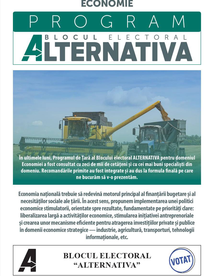 Blocul Electoral ALTERNATIVA îi îndeamnă pe cetățeni să participe la alegerile parlamentare din 28 septembrie și să voteze pentru o Moldovă unde munca este respectată, satul renaște, antreprenorii sunt sprijiniți, iar fiecare cetățean trăiește cu dreptate și demnitate.